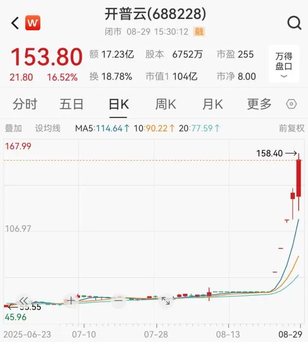 截至2025年8月29日收盘,开普云股价报153.8元/股,最新市值为103.84亿元。