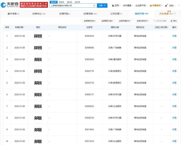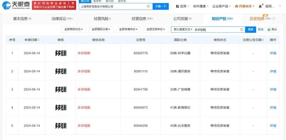今年2月,拼多多关联公司上海寻梦信息技术有限公司申请注册多枚“多多剧场”、“多多有好剧”、“多多看剧”商标,国际分类涉及教育娱乐、广告销售、科学仪器等,当前商标状态均为等待实质审查。值得注意的是,2024年9月,该公司还申请注册了多枚“多多短剧”商标。