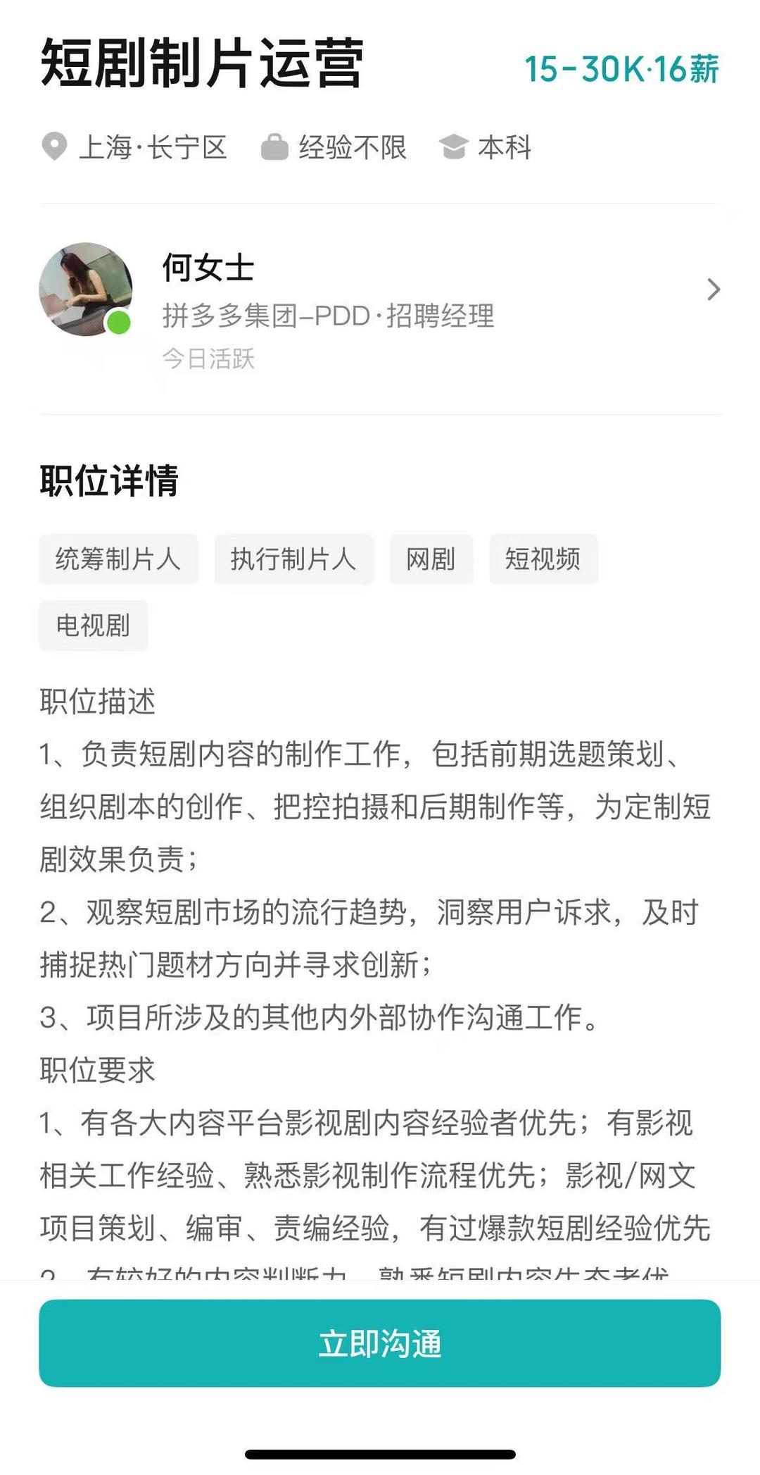 8月29日消息,拼多多在招聘平台上发布了一则引人注目的招聘信息股票配资怎么赚钱,招聘“短剧制片运营”岗位,年薪近50万,负责短剧内容制作,包括选题策划、剧本创作、拍摄及后期制作等。