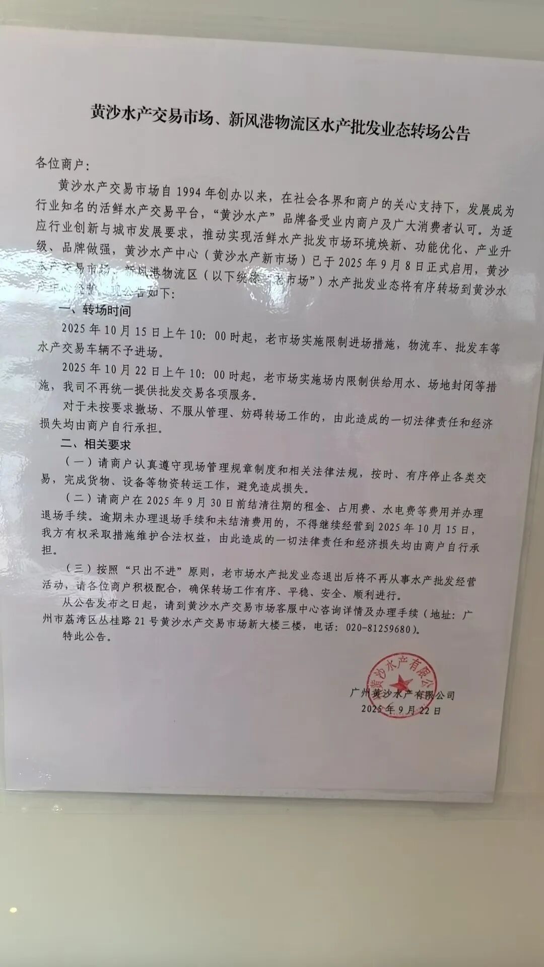 在旧黄沙水产市场经营的商户告知记者,7日收到《关于水产批发业态转场经营》的通知,提到黄沙水产中心(下称“新市场”)已于2025年9月8日正式启用,黄沙水产交易市场、新风港物流区(下简称“老市场”)水产批发业态将于10月15日开始实施限制进场措施,老市场不再从事水产批发经营活动,统一转场到新市场经营。